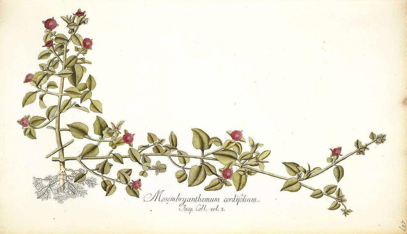 AizoaceaeOriginaria del Sur de África, actualmente se acepta que pertenece al género Mesembryanthemum (como M. cordifolium), un género con más de un centenar de especies aceptadas y varios cientos en discusión, y cuyo nombre deriva de mesémbría, 'mediodía' y ánthemon, 'flor'; aunque es muy frecuente que se conozca como Aptenia cordifolia (género nombrado a partir del griego apten, 'sin alas'). Ambos nombres comparten epíteto específico: del latín cordis, 'corazón' y folius, 'hojas', aludiendo a sus hojas acorazonadas.