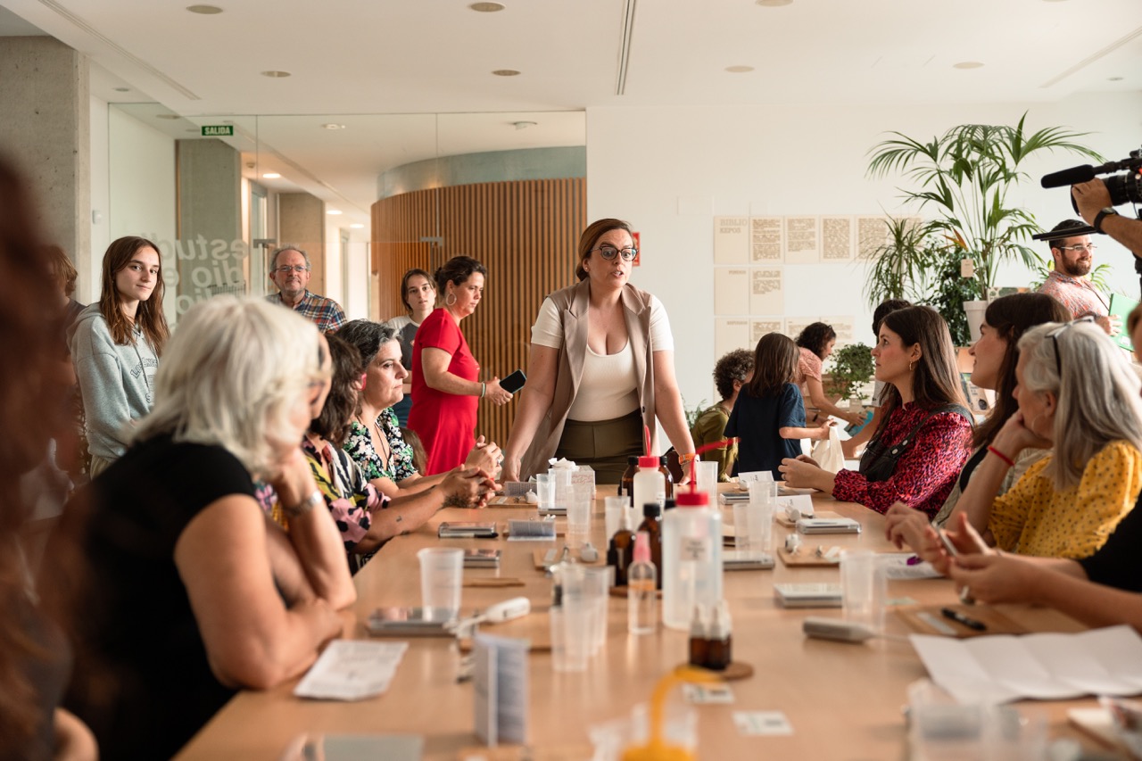 Con la satisfacción de haber logrado el objetivo, a continuación la sala se convirtió rápidamente de taller en laboratorio cosmético. Esta vez en la mesa descansaban vasos, básculas o recipientes con diferentes aceites esenciales que deberían mezclarse en las proporciones y orden adecuados para conseguir la fórmula ideada por Dolores Garvi de Bosque Anxanar.