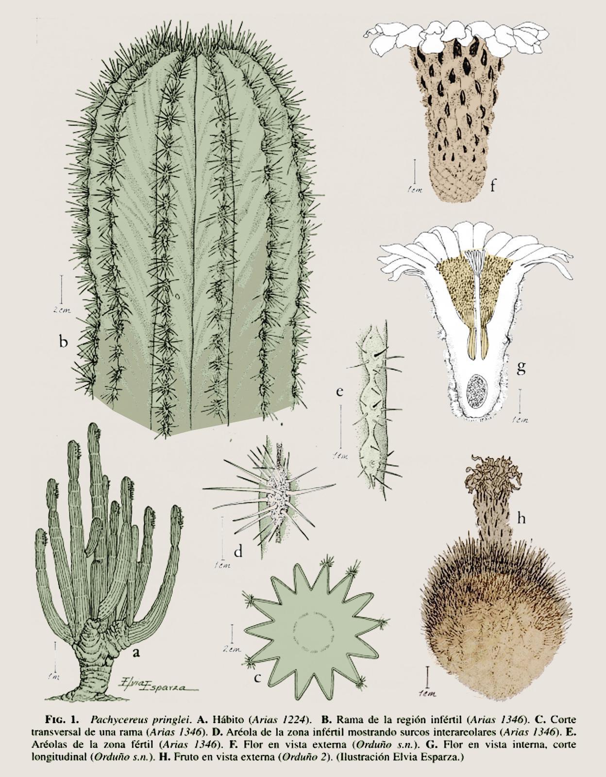 Cactus endémico de Baja California y Sonora, en México, es una de las especies de cactus que alcanza una mayor altura, incluso más de 19 metros, con unos troncos que llegan al metro grosor. En muchos sentidos se parece a otra especie también presente en Doramas, el saguaro -Carnegiea gigantea-, ya que también ramifica, formando grandes ejemplares columnares, aunque sus flores y frutos son muy distintos. Solo florece por cierto cuando es adulto, a la edad de unos 50 años, con flores medianas en forma de embudo rojas por fuera y blancas por dentro. Sus frutos y semillas son comestibles, y formaban parte de la dieta de las culturas de la zona, como los pueblos yaqui, pericúes o seri.
