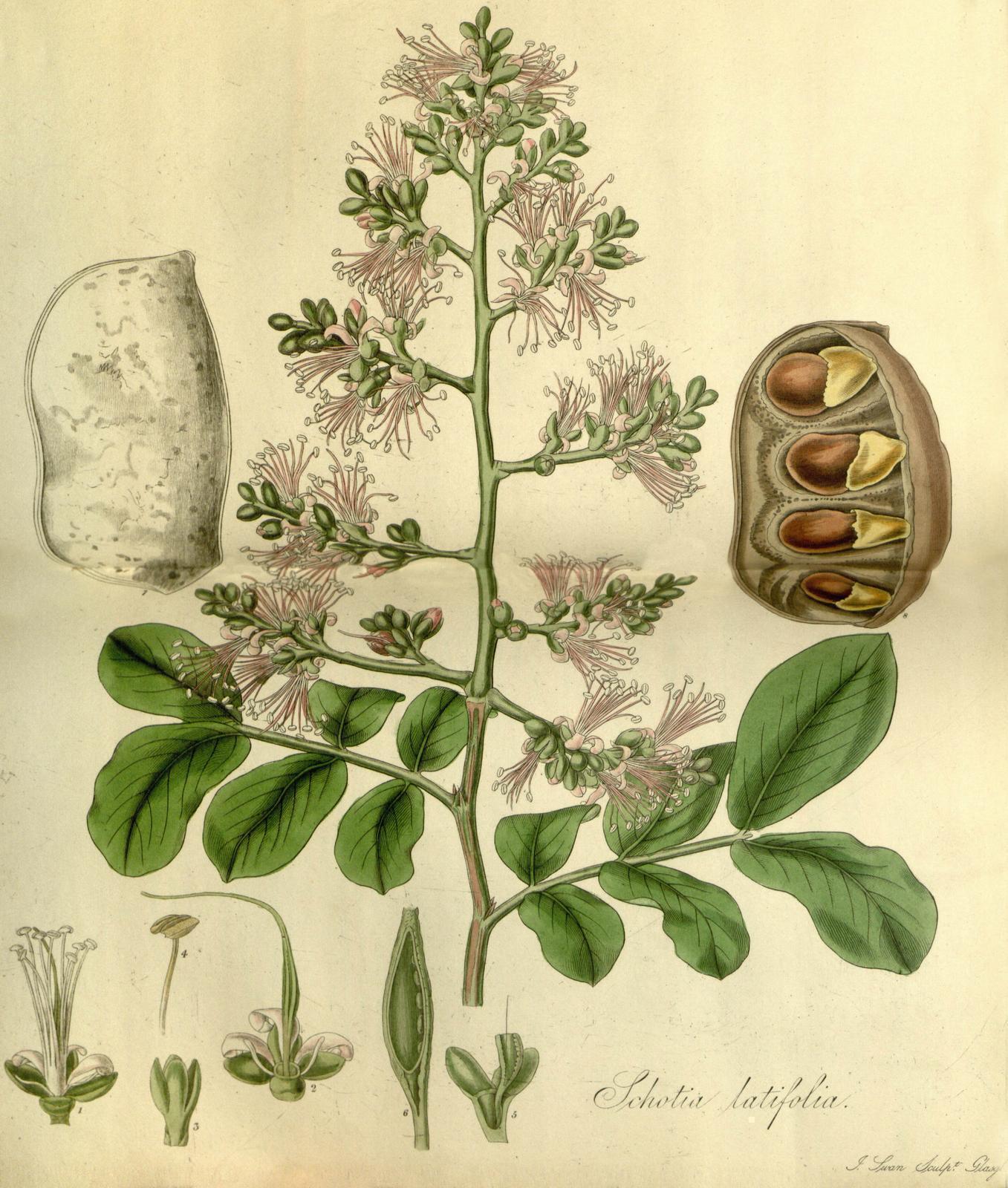 LeguminosaeEl género Schotia, que solo se da al sur del río Zambeze, en África, lleva el nombre en honor a Richard van der Schot, jardinero jefe del palacio imperial de Schönbrunn de Viena y que acompañó al botánico holandés N.J. Jacquin (1727-1817) en su exploración por Sudáfrica. El epíteto latino latifolia significa "de hoja ancha".