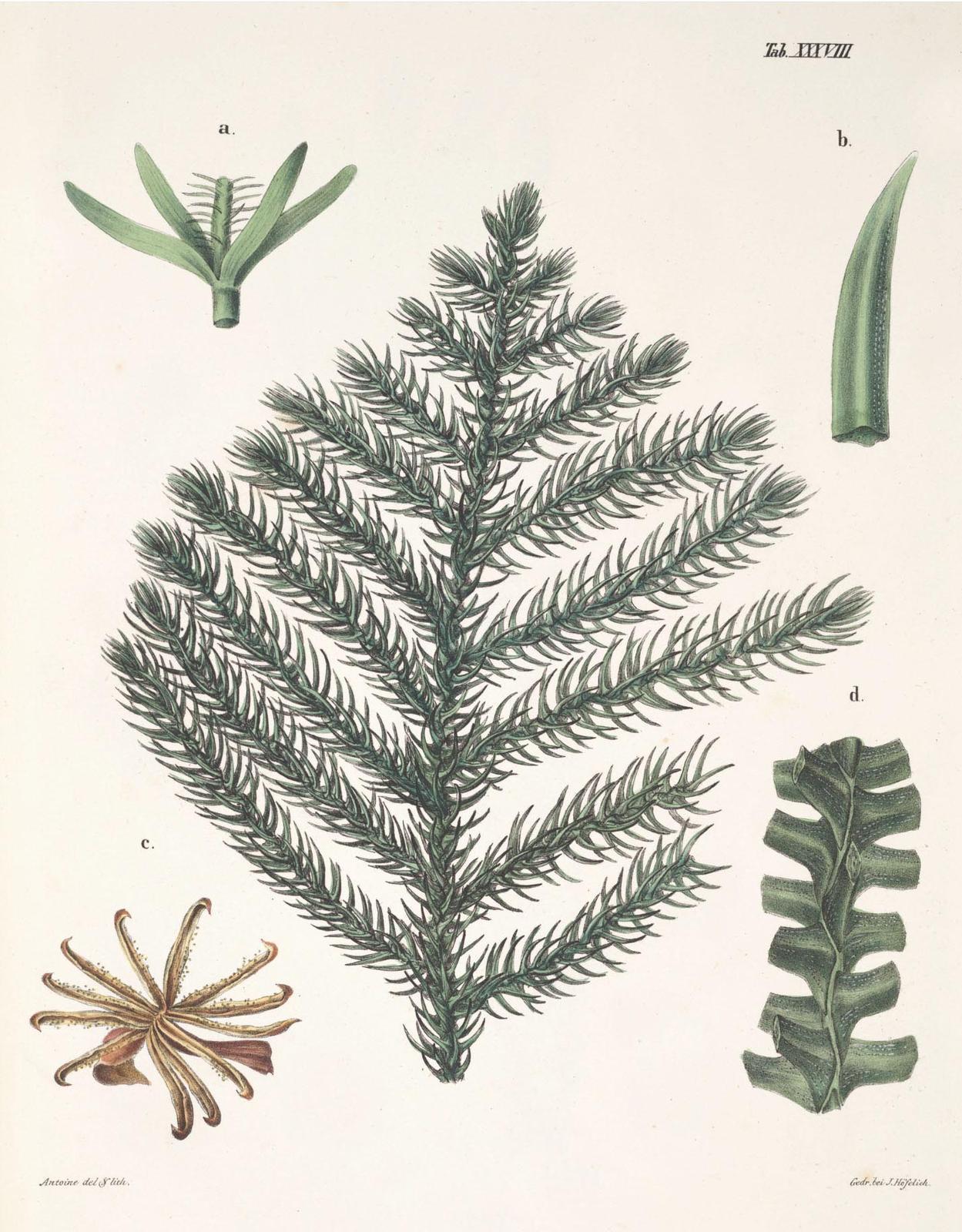 AraucariaceaeArauco, la región de Chile donde se descubrió la primera especie de Araucaria, da nombre a este árbol esbelto, muy cultivado en jardines dado su bello porte piramidal. Las semillas de la Araucaria araucana eran comidas por los indios locales, los mapuche, uno de los pueblos indígenas americanos que más plantaron resistencia a los conquistadores españoles. Alonso de Ercilla, en su poema épico 'La Araucana' (1569), nos relata con fantasía la guerra entre ambas partes que allí tuvo lugar. Los árboles, y los indios en gran medida, siguen viviendo en esta área del Cono Sur de América.