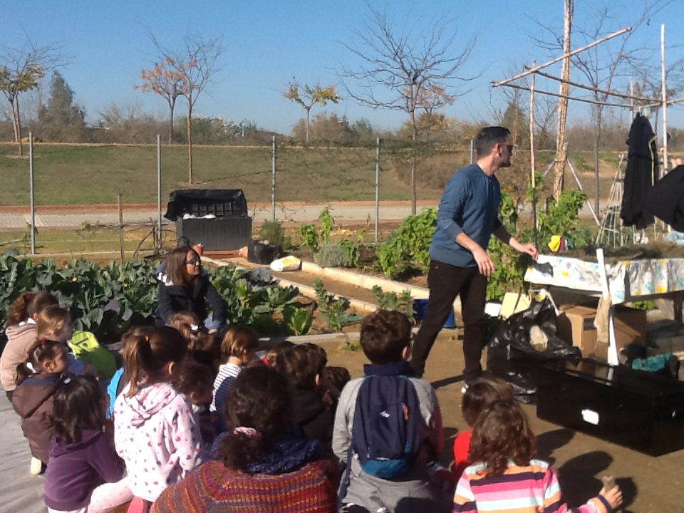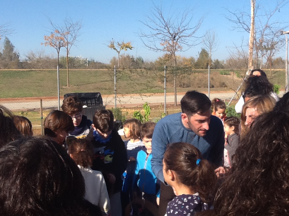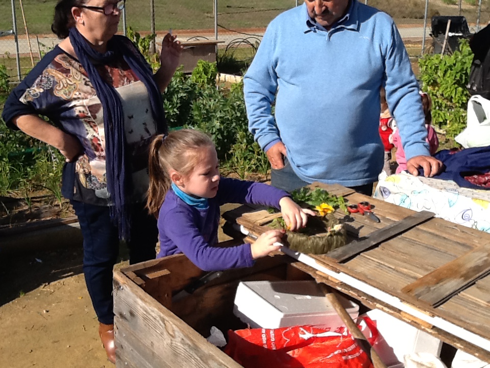 La mañana es esplendida en la Vega de Triana, parece una mañana de primavera pero estamos a 10 de diciembre. Fran, María y Ana aparecen con sus bártulos para el taller de coronas de luz pero algunos niños y padres se les han adelantado impacientes por empezar a trabajar, al principio tímidos pero pronto no hay quien los pare, corretean por los huertos recogiendo plantas y flores con los que adornar sus coronas. El tiempo que les hemos visto disfrutar se nos ha pasado volando a los hortelanos. Esperamos verlos muchas veces por los huertos.