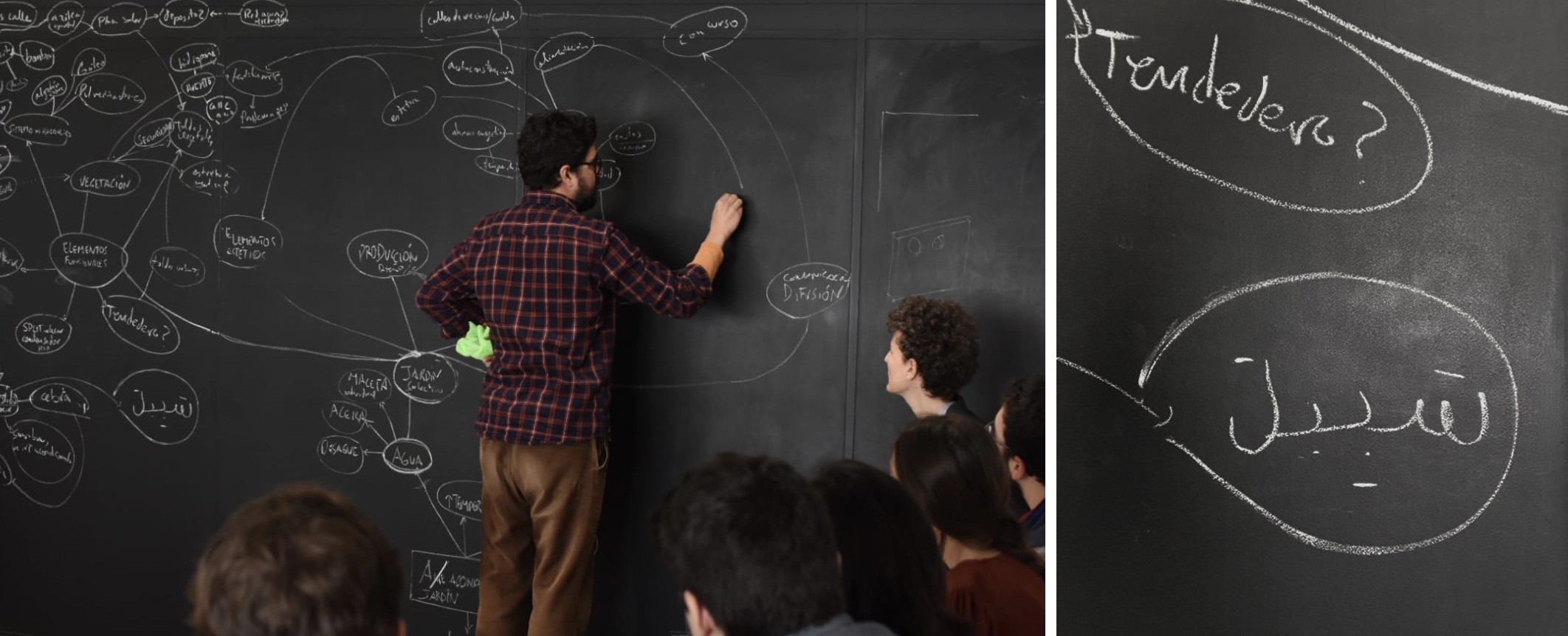 Así, en el camino de estas sesiones fuimos tomando conciencia de las implicaciones formales, pero también de las tecnológicas, ambientales, económicas o sociales vinculadas a la iniciativa. En este sentido, el diseño del proceso cobraba más importancia que el diseño del objeto: ¿el agua de los aires se puede utilizar directamente o necesita un tratamiento químico? ¿Quién aprovecharía el agua residual? ¿Sería más óptimo diseñar microjardines independientes o un jardín comunitario más resiliente? ¿Se podría gestionar de manera individual o debería ser una institución colectiva? ¿Cómo funcionan los procomunes relacionados con la gestión del agua? ¿Convendría hacer un diseño para los soportes o mejor adaptar la tecnología existente de los aires acondicionados customizándolos? ¿Qué opción facilitaría su implementación? ¿Cómo adecuarnos mejor a la normativa? ¿Qué beneficios podrían aportar estos “jardines”? ¿Qué podría hacerse con los otros residuos asociados? ¿Qué otros procesos asombrosos podrían generarse a partir de ellos? ¿Cómo podrían incentivar estos inputs la adopción y proliferación de estos dispositivos paisajísticos? ¿A dónde nos conectan estas palabras escritas en árabe por una de las compañeras de AEDI?... Las mashrabiyas aparecieron en escena.