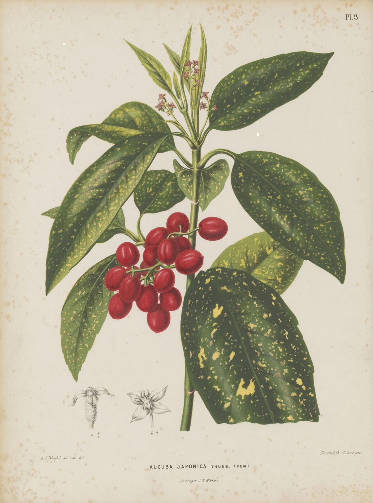 GarryaceaeEl género Aucuba deriva de la palabra japonesa アキュバ , "Akiyuba", nombre con que se conoce en su país originario al laurel moteado, a cuya procedencia alude su epíteto específico, aunque también está presente en China.