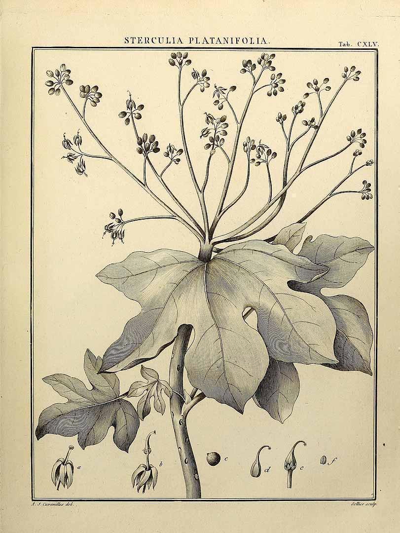 Es frecuente que se nombre con el sinónimo Sterculia platanifolia. La subfamilia Sterculioideae recoge a los denominados como castaños tropicales. El epíteto específico platanifolia alude a sus hojas similares a las del platanero, mientras el genérico, deriva de Sterculius, dios romano de las instalaciones de saneamiento, del abono y los excrementos, algo muy relevante en culturas agrarias, pero en este caso haciendo alusión al desagradable aroma de sus flores.