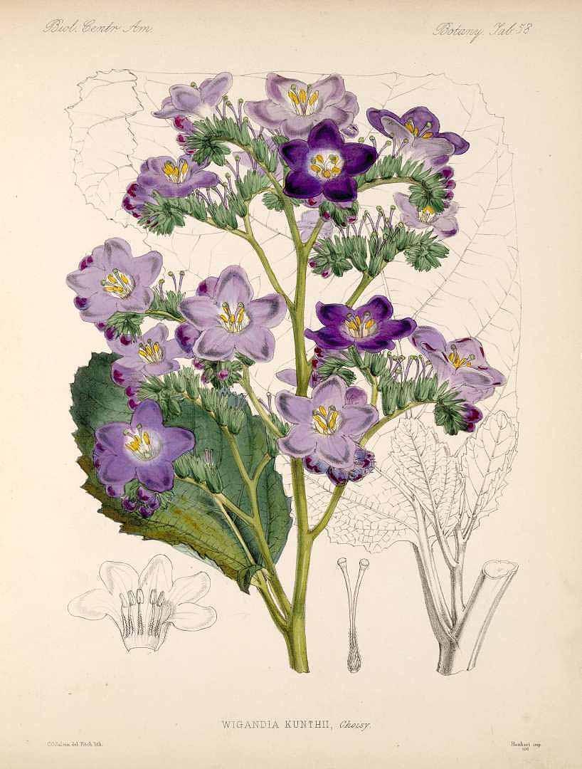BoraginaceaeExuberante arbusto americano, presente desde México a Venezuela y Colombia. El género Wigandia está dedicado al obispo luterano alemán Johan Wigand (s.XVI). El epíteto latino urens, 'que escuece' (urticante), alude a la irritación que provocan en la piel sus secreciones. También es frecuente encontrarla referenciada como W. caracasana en alusión a la capital venezolana, uno de sus lugares de origen.