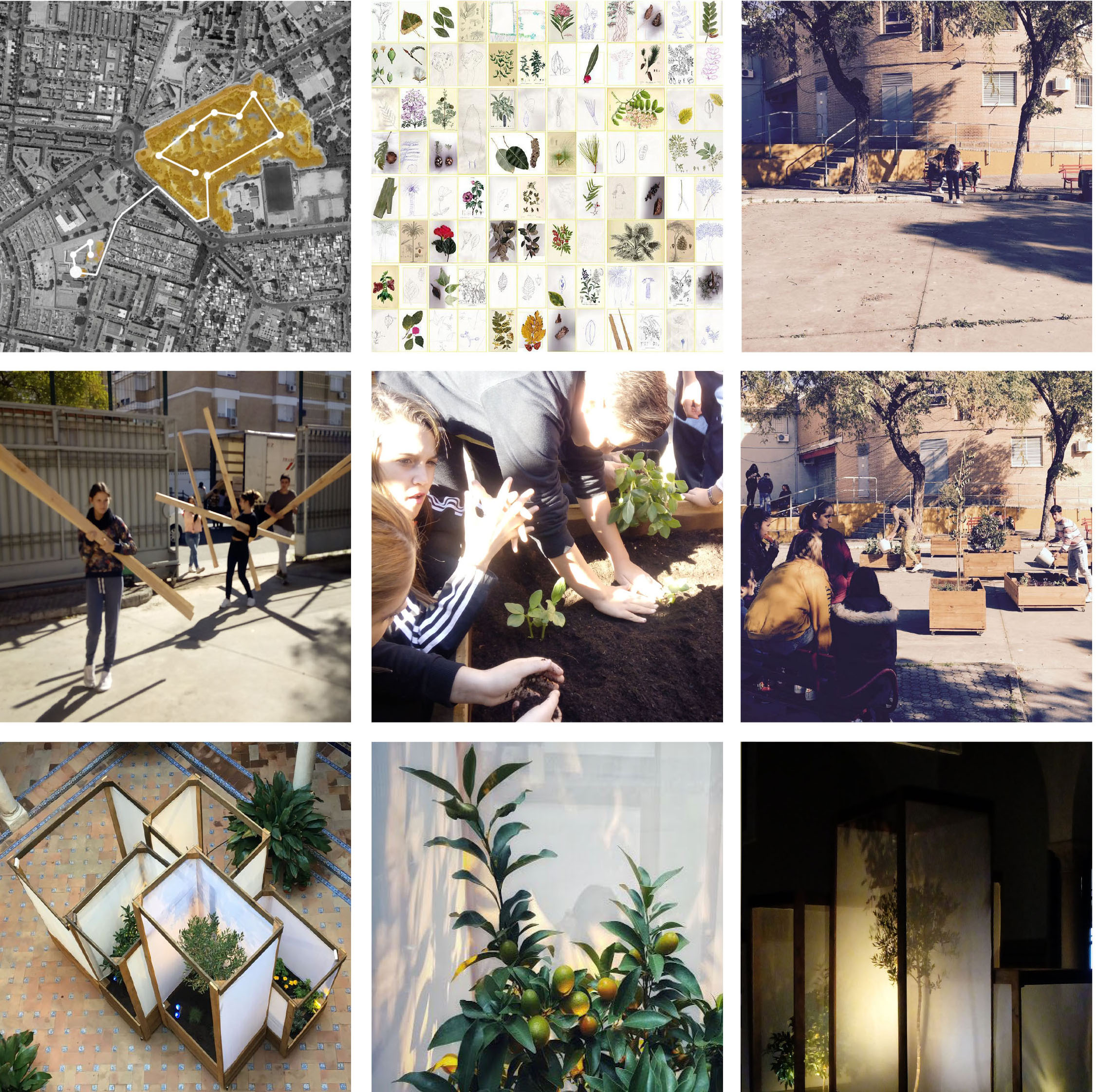 A continuación nos gustaría dar la enhorabuena a las comunidades educativas con las que hemos trabajado este año y cuyos proyectos de largo recorrido son, en definitiva, los reconocidos con esta selección. Después de todo el objetivo inicial de Luces de barrio era celebrar la labor de estas instituciones que están repensando los entornos escolares como espacios innovadores de aprendizaje, integración y sostenibilidad. Concretamente nos referimos a los colegios de Huerta de Santa Marina en el distrito centro, Vélez de Guevara en Torreblanca, Andalucía en la barriada Murillo, San José Obrero en la Macarena y el instituto Salvador Távora en Rochelambert, y especialmente a sus ejemplares equipos directivos, de los cuales hemos aprendido tanto, y a los más de 250 estudiantes que elaboraron los inventarios de especies botánicas de sus entornos más cercanos, compartieron lo hallado con la ciudad a través de cartografías digitales, y diseñaron a partir de los nuevos conocimientos y con ayuda de profesionales, paisajes potenciales orientados a mejorar la salud, el clima, la alimentación, la biodiversidad y la educación de los propios colegios a través de estrategias basadas en la naturaleza.