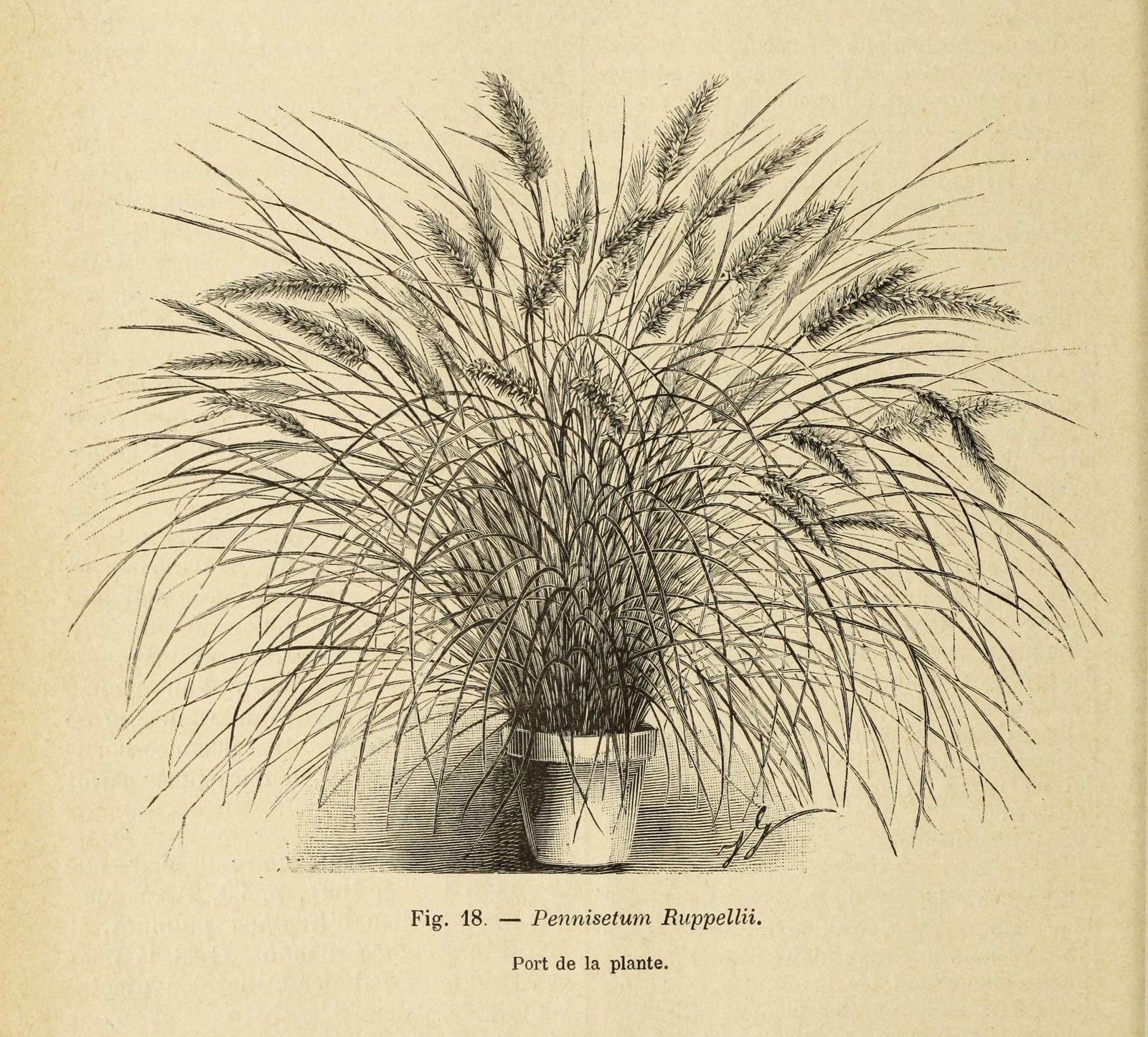 PoaceaeEl género Pennisetum engloba unas 80 especies de plantas herbáceas perennes presentes en todas las regiones templadas del planeta. Esta especie en concreto es originaria del norte de África y África oriental. El nombre genérico deriva del latín penna, 'pluma' y seta, 'cerda', en alusión a la espiga que conforman sus flores. El epíteto setaceum, 'con cerdas', alude nuevamente a la inflorescencia.