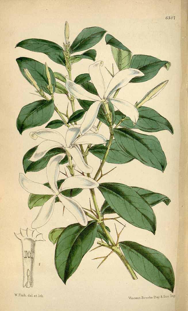 Sus flores blancas perfumadas de 5 pétalos recuerdan a la flor del jazmín, pero son mucho más grandes. Los frutos rojos, en forma de ciruelas alargadas, también se cultivan fuera de su hábitat natural en Nicaragua. Sus raíces también tienen usos medicinales en la tradición zulú.