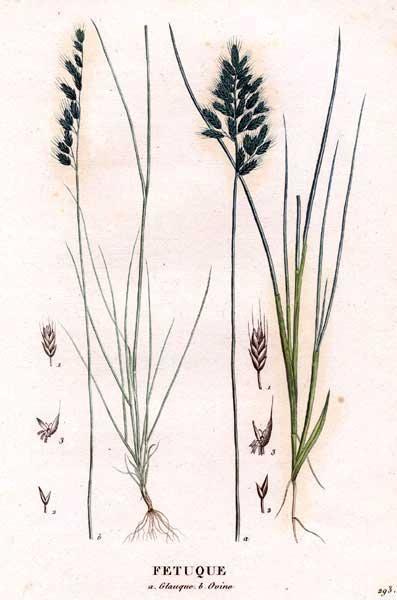 PoaceaeEl género Festuca toma su nombre del nombre latino para "tallo" o "brizna de paja", y engloba a entre 450 y 600 especies de herbáceas, muchas de interés forrajero. El epíteto latino glauca significa "color verde azulado". Esta especie es originaria de Europa.