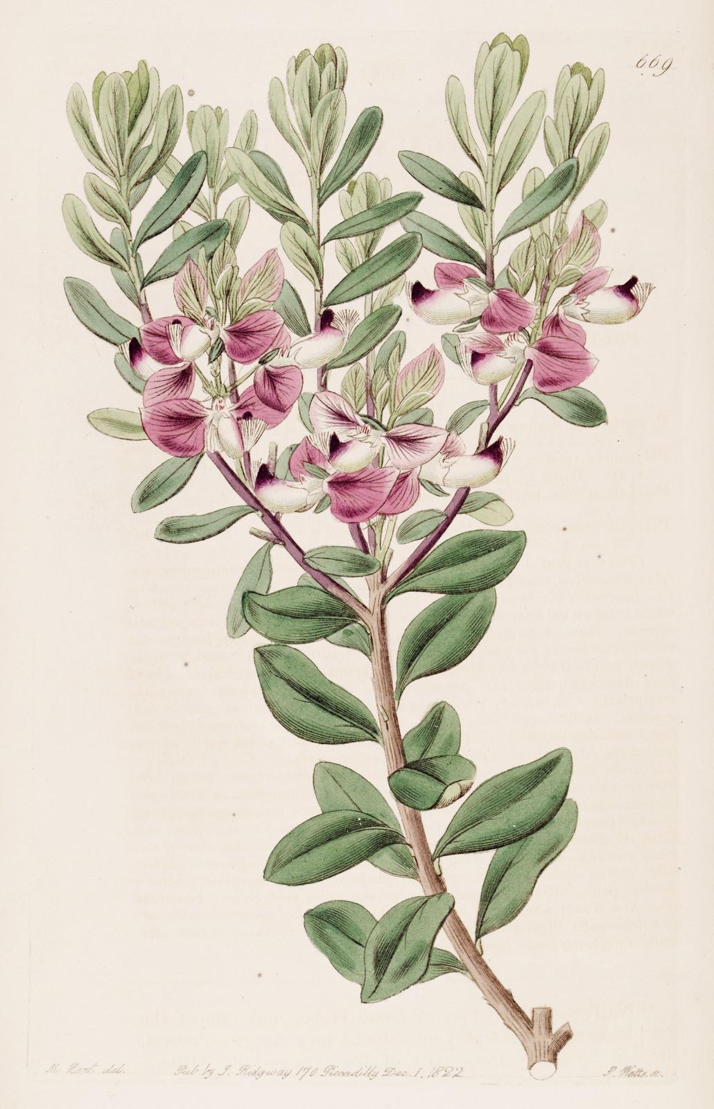 Planta de origen sudafricano, con llamativas flores en forma de mariposa púrpura, forma parecida a las de las leguminosas, y semillas en una cápsula alada. Florece gran parte del año (más aún en climas cálidos), lo que la hace muy interesante para uso ornamental.
